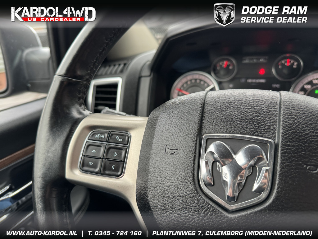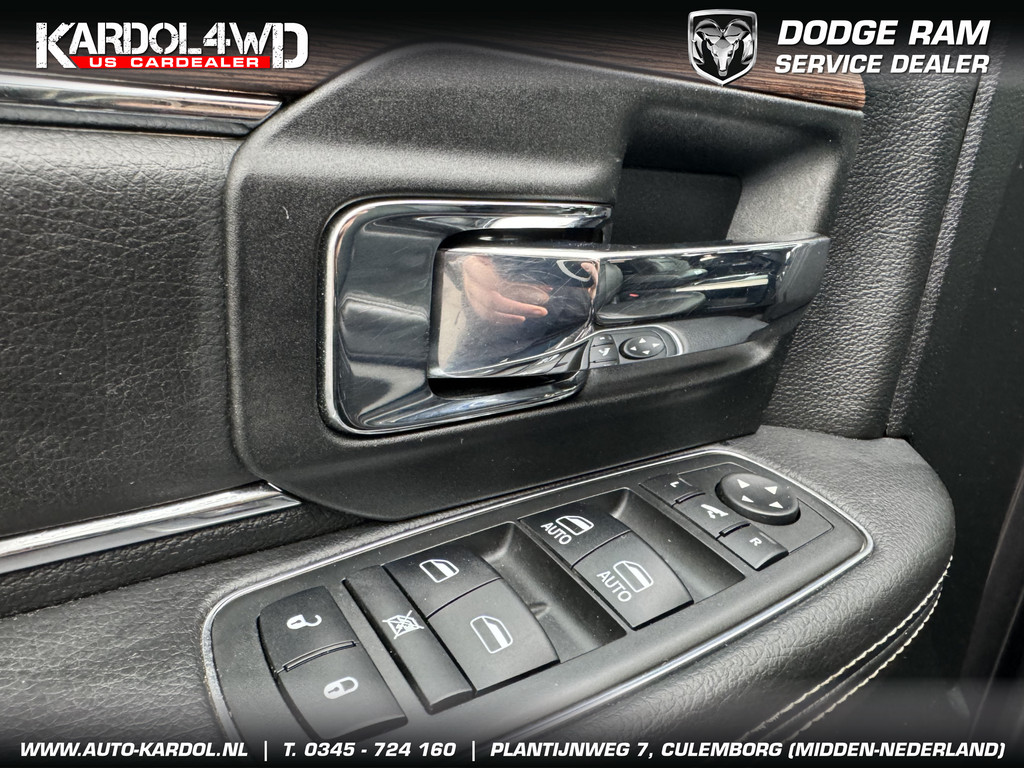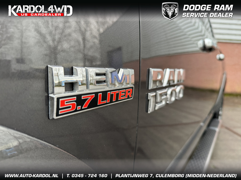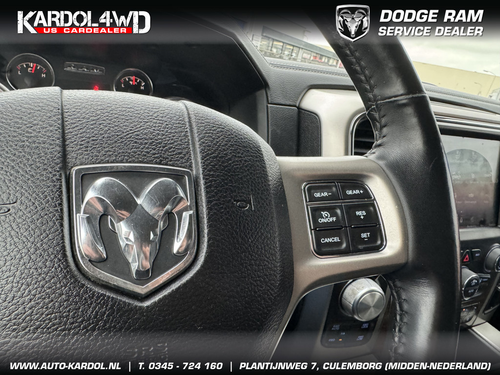 Pittig, wendbaarder dan je denkt. Perfect in conditie, een top-occasion! Een achtcilinder benzinemotor en een automatische transmissie zorgen samen voor een snelle en comfortabele rijervaring. Ongeacht het aantal inzittenden blijft de hoogte van deze Dodge Ram 1500 altijd constant, dankzij de luchtvering. De auto is voorzien van een mooie en comfortabele lederen bekleding. De verwarmbare voorstoelen zijn een heerlijke extra optie, waarmee u uzelf en uw bijrijder een groot plezier doet. Opwarmen in koude dagen? Pak het verwarmd stuurwiel met beide handen aan! Ook 20 inch lichtmetalen velgen, trailer assistent, zwarte hemelbekleding, neerklapbare achterbank, elektrisch verstelde en verwarmde buitenspiegels en elektrisch bediende ramen zijn aan boord.